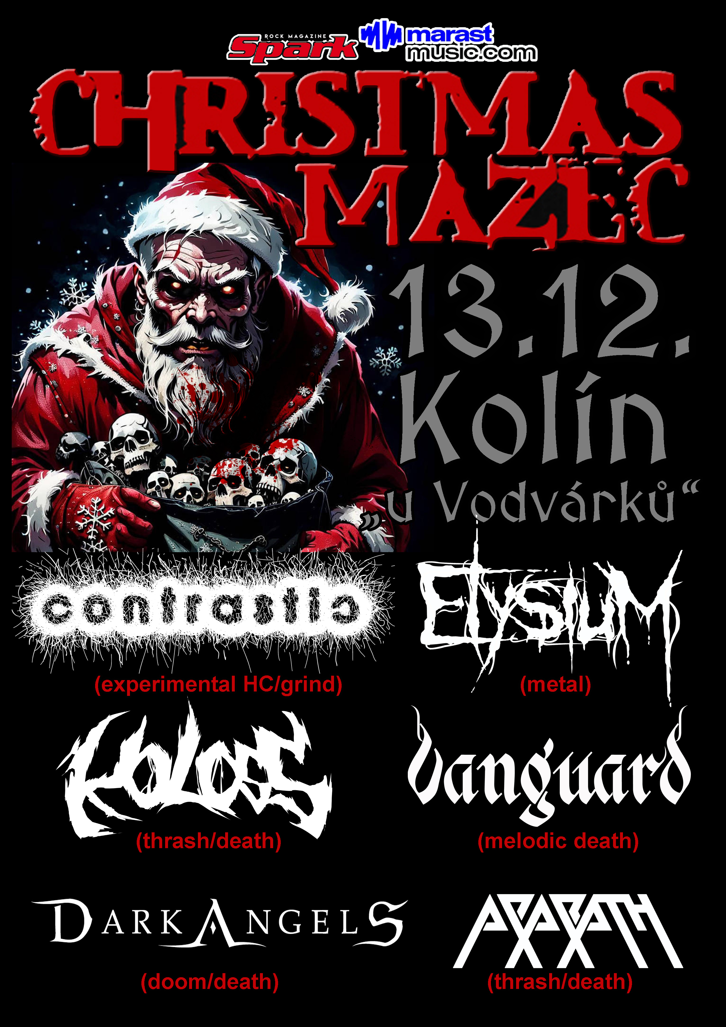 Bohužel původně avizovaní Contrastic nemohou přijet, pročež vystoupí zlověstný nasypaný deathmetal, z pekla - LEGION! Kapela VANGUARD už u nás sice hrála, ale od té doby udělala obrovský krok vpřed. Jejich melodický death metal teď zní ještě vyzráleji a má až hitový náboj. Takže je nejvyšší čas si tuhle jízdu zopakovat. Thrashové srdce s pořádnou dávkou deathmetalové agrese rozbuší mladá krev APARATH a ostřílení borci z Prahy KOLOSS. První jmenovaná banda nám předvede, že metal není mrtvý – naopak, že omladina má pořád co říct a umí to narvat pěkně zostra. Druzí zmiňovaní zase předvedou zkušenost a preciznost ve skládání i prezentaci. Na temnější notu nás vezmou budějovičtí DARK ANGELS. Jejich doom/death je jako tíha mrazivé mlhy, která vás obklopí a nepustí. Temnota, co vás pohltí, ale přesně to co před Vánoci potřebujeme. No a samozřejmě nesmí chybět domácí ELYSIUM – pořádající parta, která vždycky dovede večírek do varu. Hoši to do vás nasypou tak, že se vám bude třást půllitr v ruce. Makají na nových peckách, takže čekejte i čerstvou nálož rovnou která bude kopat do zadku jak Jerry Toma.