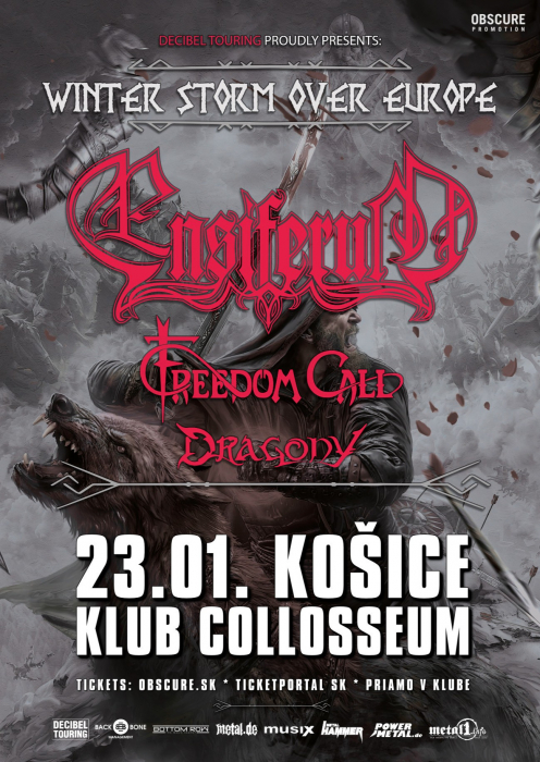 Bardi severného folk metalu Ensiferum vyrážajú na zimnú výpravu po Európe – a zastavia sa aj v Košiciach! Na pomoc si prizvali nemecké power metalové ikony Freedom Call a rakúskych symfonikov Dragony. Vychutnajte si večer plný severskej mytológie a fantasy príbehov v podaní troch majstrovských rozprávačov!