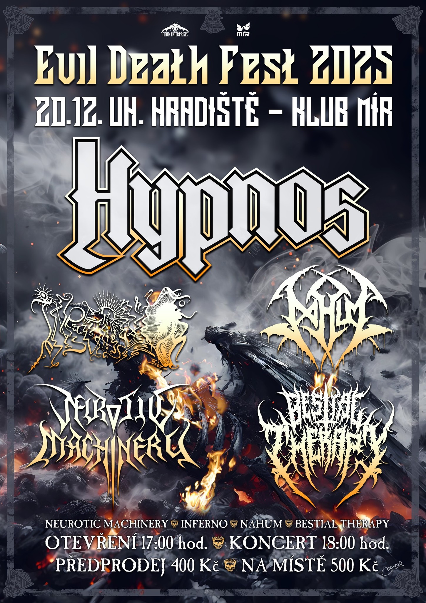 Hypnos (CZ) – web / fb / bandcamp / insta / youtube / SpotifyBestial Therapy (CZ) – fb / bandzone / bandcamp / instaNeurotic Machinery (CZ) – fb / bandzone / bandcamp / insta / youtubeNahum (CZ) – web / fb / bandzone / bandcamp / youtubeInferno (CZ) – fb / bandcamp / insta / youtube / Spotify
