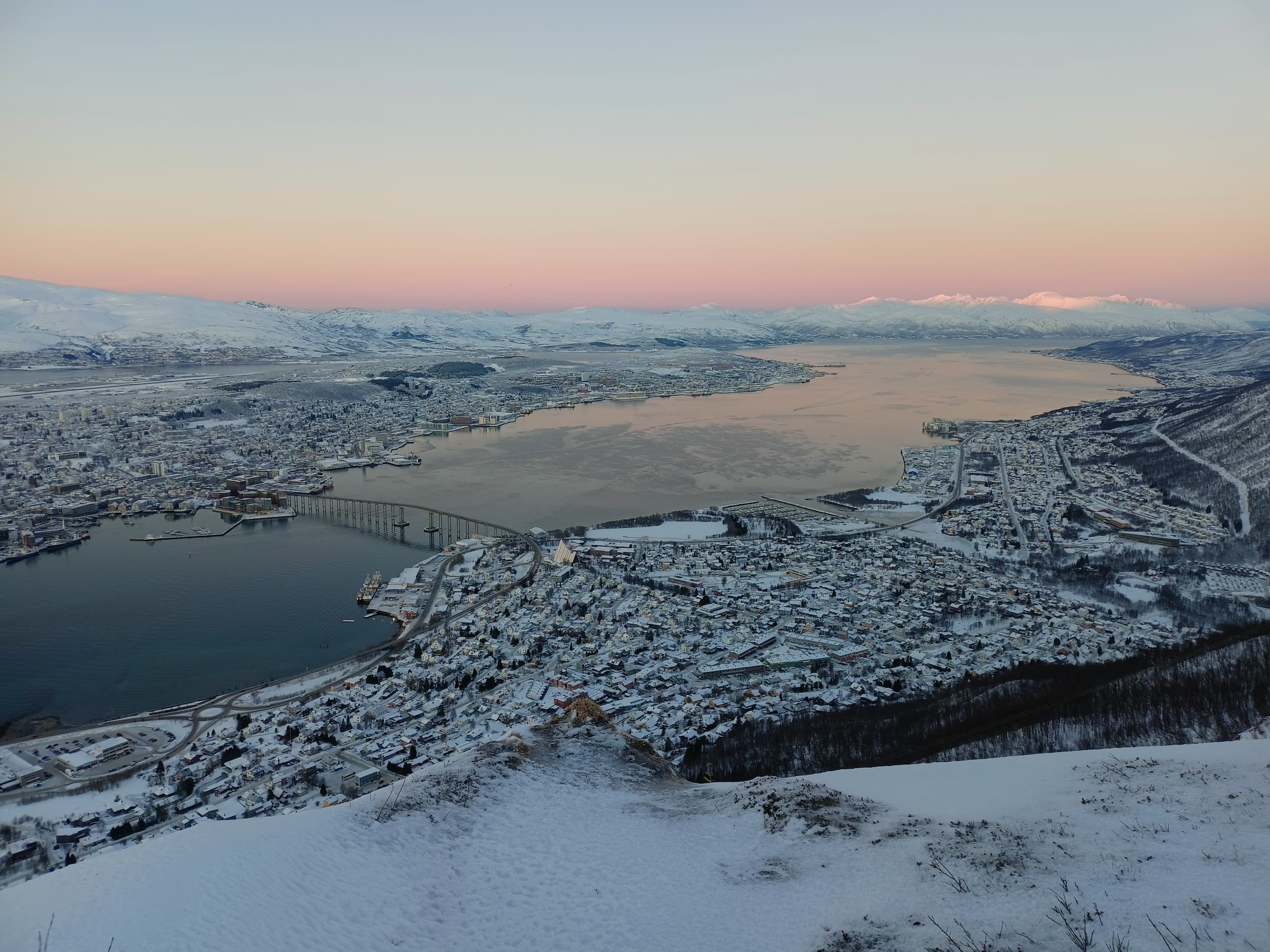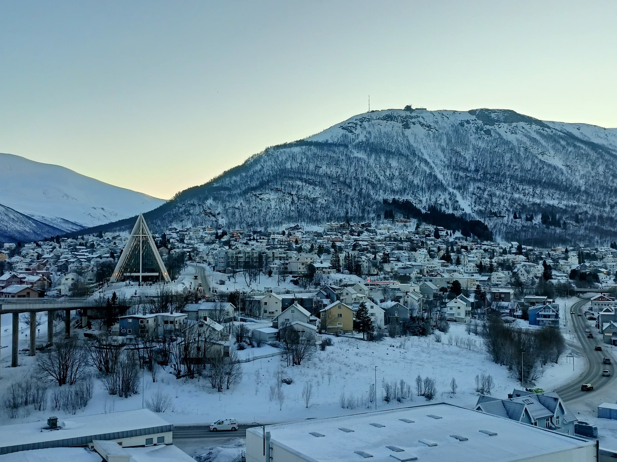 Začínáme procházkou přes most Tromsøbrua, který spojuje ostrov, na kterém se rozléhá většina Tromsø, spolu s jeho východní částí na pevnině. Zde se nachází také již zmíněná Arktická katedrála, u které jsme byli už ve středu v noci, ale až v pátek jsme se podívali dovnitř. Celkem zajímavá moderní stavba, odkud je i hezký pohled na most a na druhý břeh.