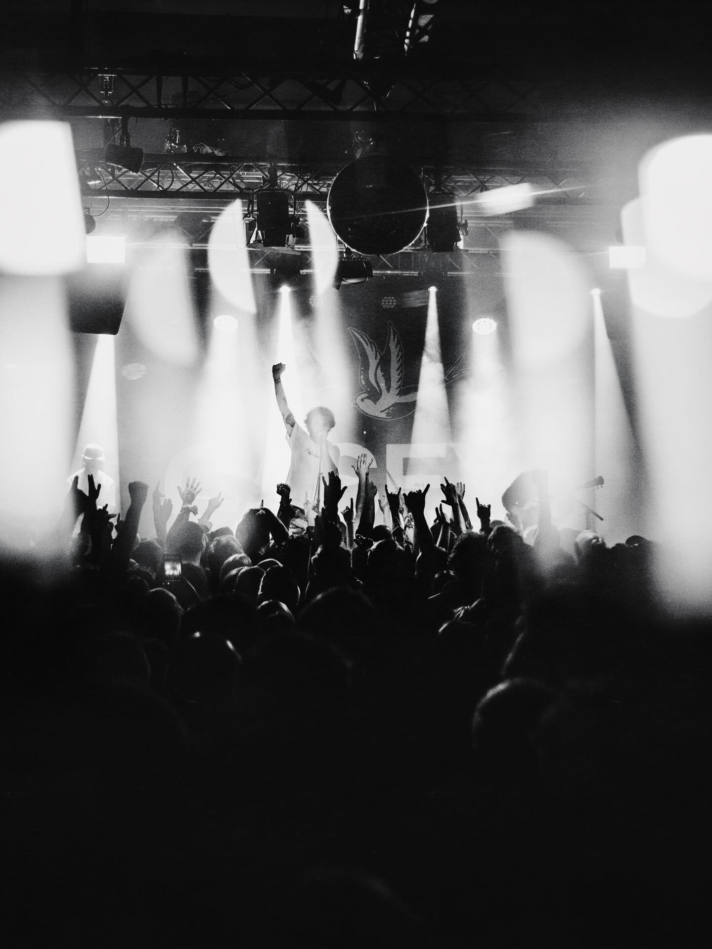 screamuje, vyzývá k moshování a headbangingu, skáče z pódia a