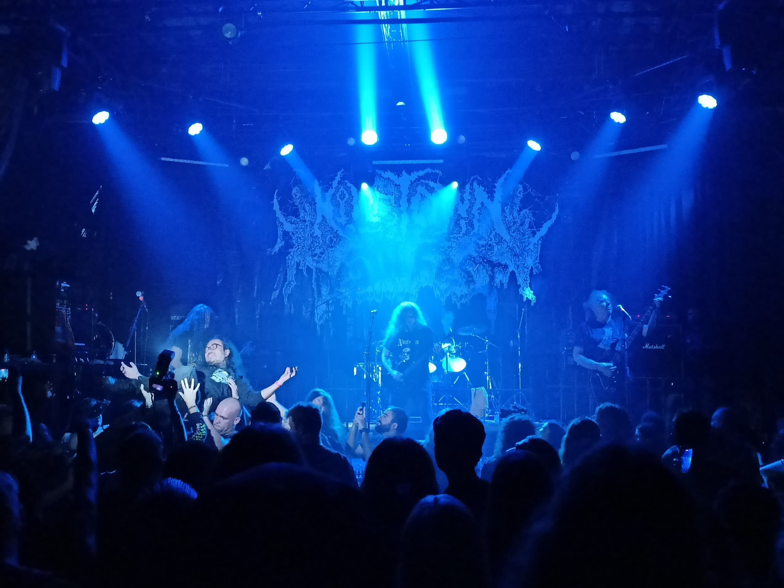 Začalo se, jak jinak, než Increatum Vox. Stejně jako loňskou monstrózní desku, i koncert tento otvírák odpálil velmi mocně. Nechci říct, že to znělo fakt jako z alba, protože přidaná hodnota v živém provedení rozhodně byla. Ale Mitochondrion měli hned od začátku perfektní zvuk, který byť byl přesně dle jejich modelu správně špinavý, furt v něm šly krásně konkrétně slyšet obě kytary. K tomu naprosto masivní a pro subžánr hodně promyšleně zahrané bicí a tři vokály. Tady bylo okamžitě jasné, že to bude o několik tříd lepší než jejich koncert ve Vopici před 11 lety (na který však kapela, hlavně díky výborné odezvě fanoušků, dodnes ráda vzpomíná).