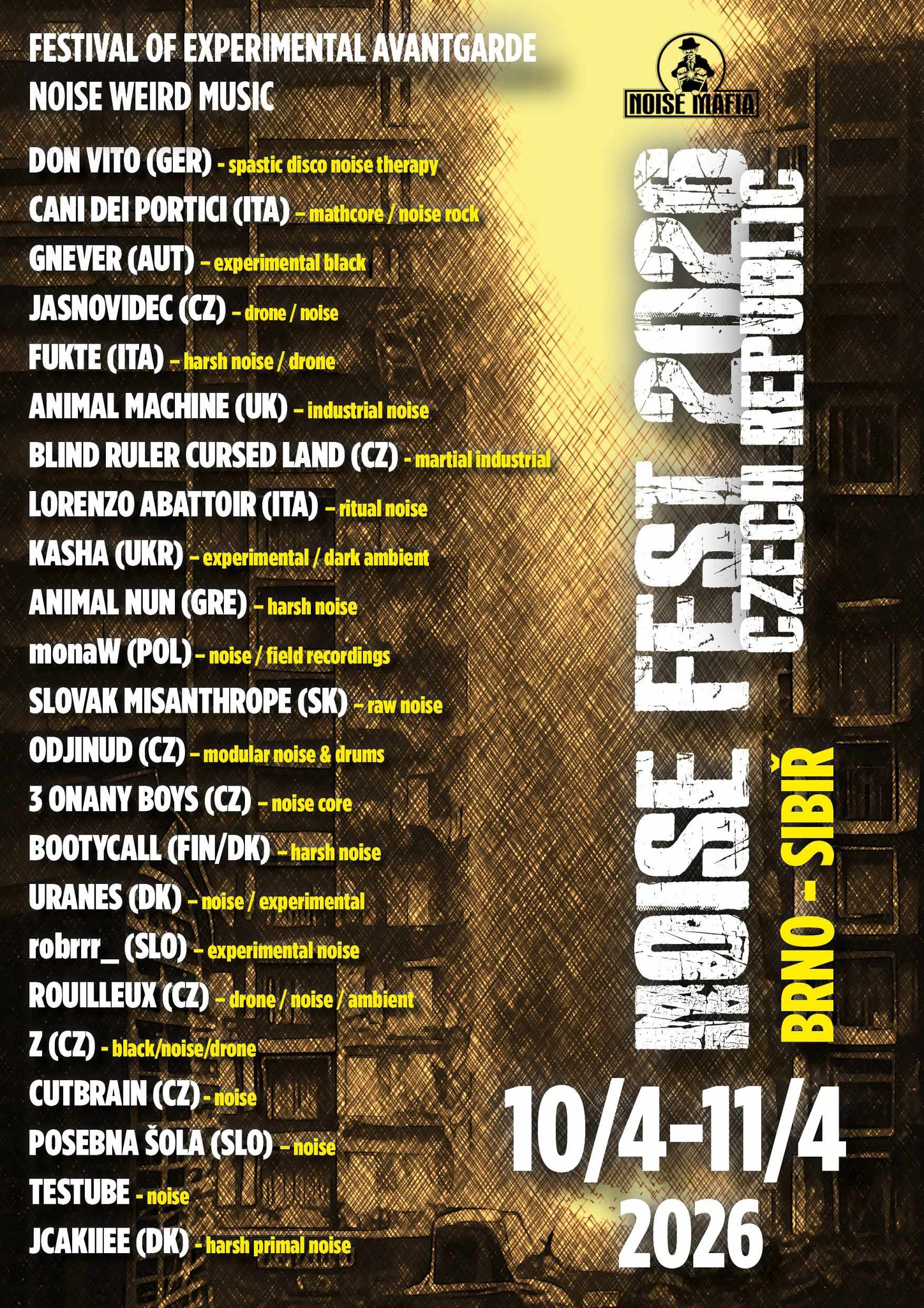 Brněnský Noise Fest, který pořádá Obstík z Usnu?, je už na hlukové scéně poměrně zavedeným pojmem. Pokud se nepletu, v částečně přerušované podobě (covid a tak žejo) se koná už od roku 2014. Z roku 2018 dokonce na Marastu najdete report. Tehdy se akce konala ještě v Altbaru, ale poslední ročníky našly útočiště na Sibiři.