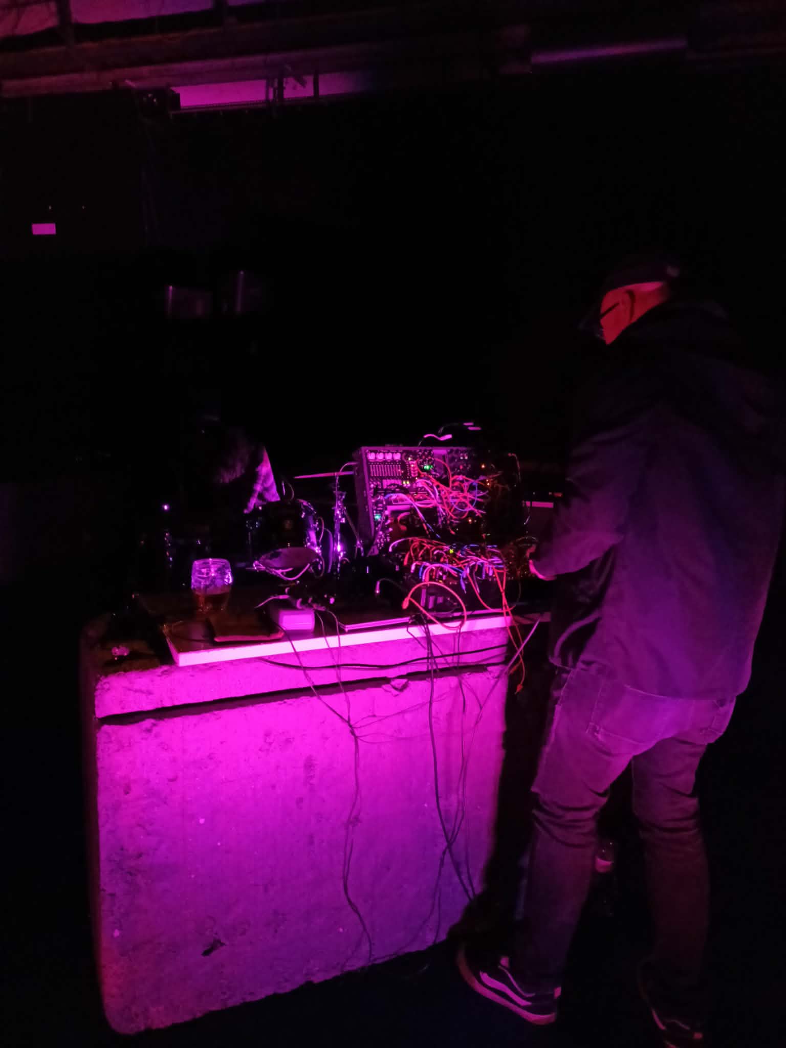 Slovak Misanthrope pak zase rozjel dost syrový harsh noise s tunou distorze, kterej hodně vydatně hučel a skřípal. Na stole několik pedálů a různých snímačů, do kterých nonstop rýpal. Jeho set se tedy furt zvukově měnil, hvízdal, zasekával a zintenzivňoval až do té doby, než jej utnul. Jo, tenhle aktivnější přístup k bordelu mám rád.