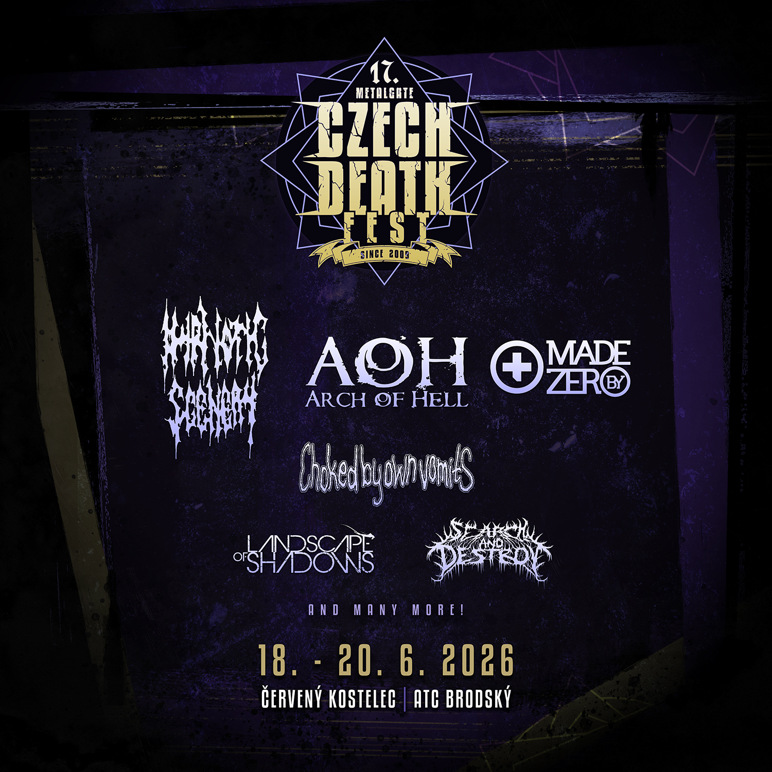 Line-up MGCDF 2026: ABRUPT DEMISE, ARCH OF HELL, ASPHYX, ATROX TRAUMA, AVERNAL, AVULSED, BJES, BLOODBATH, COLOSALIST, DARKFALL, DESTROY, DISBELIEF, DYSANGELIUM, FATALITY, FLESHLESS, FRACTURATED INSANITY, HORRIBLE CREATURES, HYPNOTIC SCENERY, CHOKED BY OWN VOMITS, INSANIA, LANDSCAPE OF SHADOWS, MACERATION, MADE BY ZERO, MELANCHOLY PESSIMISM, MOHYLA, NAHUM, POSSESSED, RADIATHOR, REDZED, ROTPIT, The Laws performing SARCÓFAGO, SARCOM, , SEARCH AND DESTROY, SHINIGAMI, SOUL MASSACRE, THY LEGION, TORTHARRY, TRIGONUM MORTIS, TSJUDER, VANGUARD